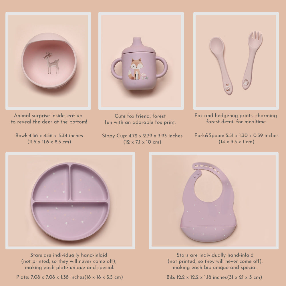Made from 100% food-grade silicone, each piece is soft, durable, and safe. With charming forest-themed details, mealtime becomes a joyful, engaging learning experience for babies and toddlers.