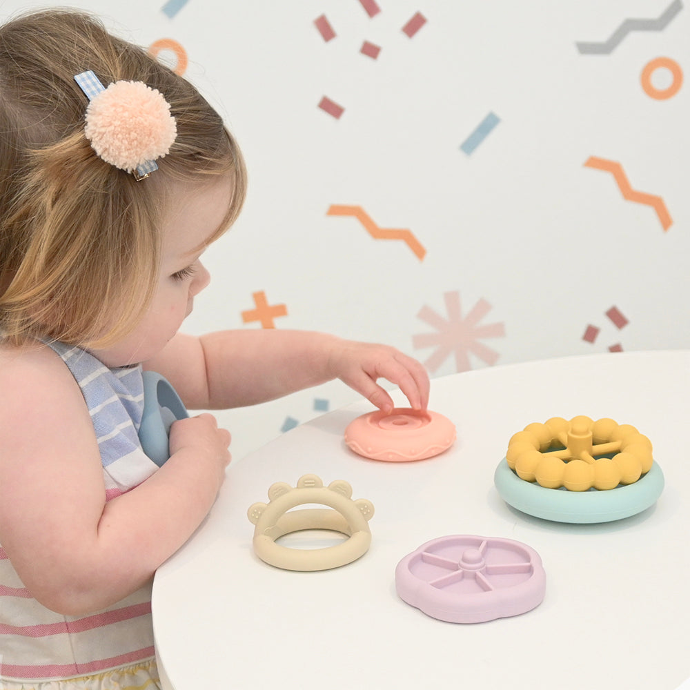 Develop your baby's fine motor skills with this fun multi-purpose silicone stacker. Made from 100% silicone, your little one can practice their hand-eye coordination whilst also using the stacking rings as teether to soothe sore and tender gums. It's playtime and teether relief all in one adorable package.